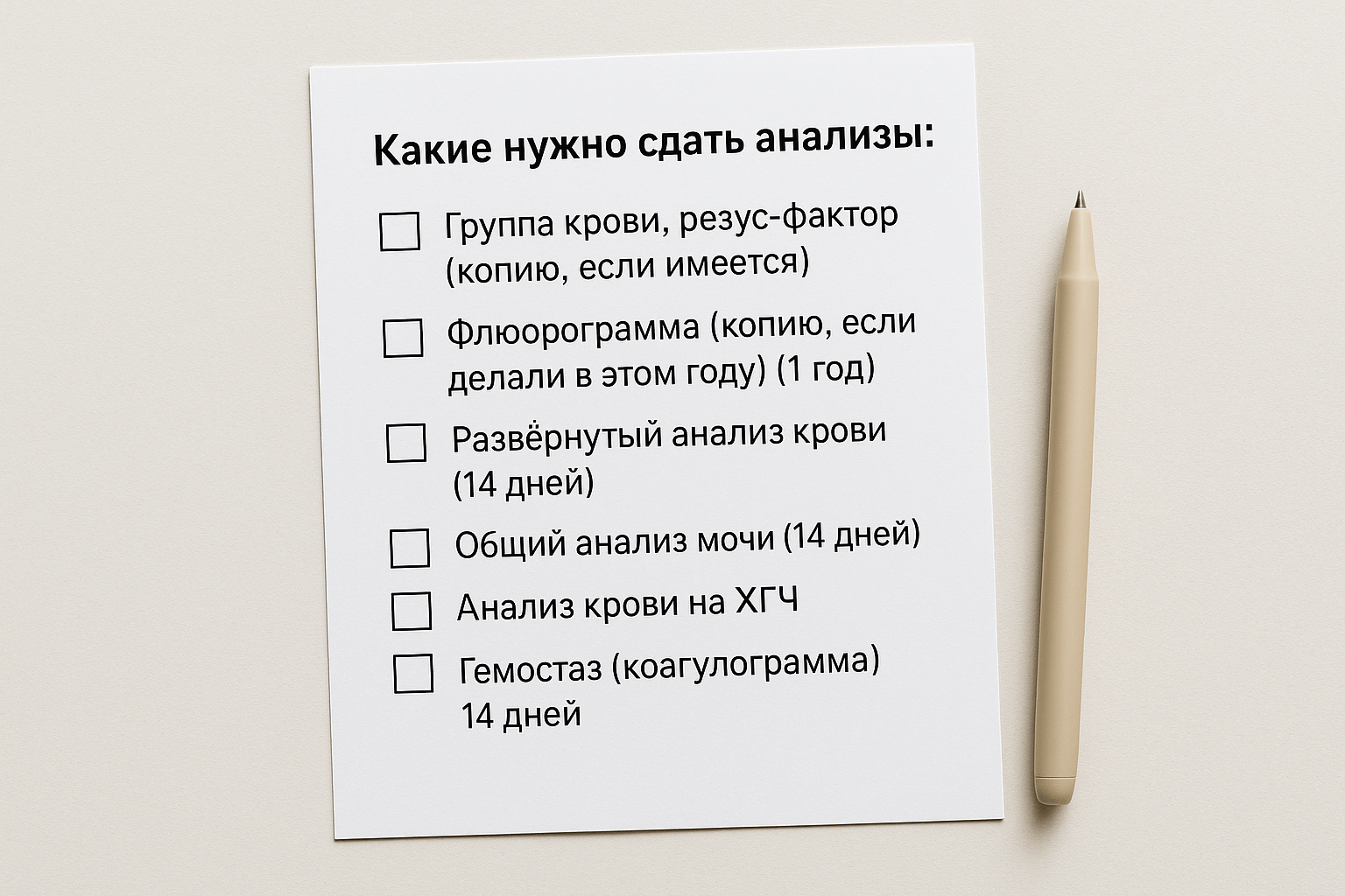 Перед операцией потребуется предоставить результаты следующих исследований (сроки действия указаны в скобках):